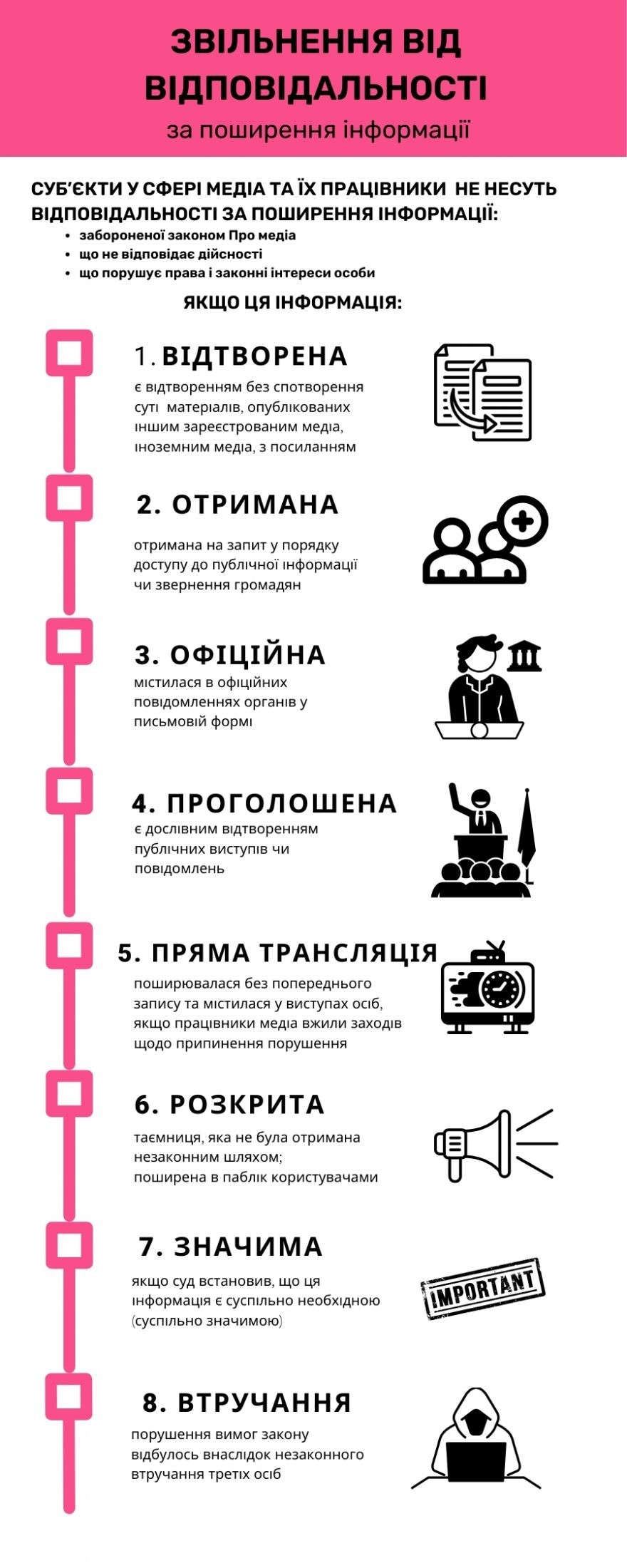 - Якщо інформація є дослівним відтворенням або матеріалів, опублікованих іншими зареєстрованими медіа, або матеріалів іноземних джерел (з посиланням на них), то суб’єкти у сфері медіа і їхні працівники не несуть відповідальності за поширення цієї інформації.